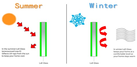Almost 3/4 of total heat loss in a standard window occurs because the warm inner pane of a double glazed window readily emits heat to the cooler outside pane. LowE glass disrupts that transfer of heat loss and improves the insulating value in the winter by approximately 50%. LowE glass also reduces solar heat gain in the summer by the same amount, approximately 50% over standard clear glass. These energy savings will contribute significantly at reducing energy costs. LowE glass also filters out nearly twice as much of the damaging UV radiation than clear glass, helping to prevent fading to draperies, flooring and furnishings. LowE glass will not just save you money, it will help to maintain a uniform comfort level throughout your home all year long.